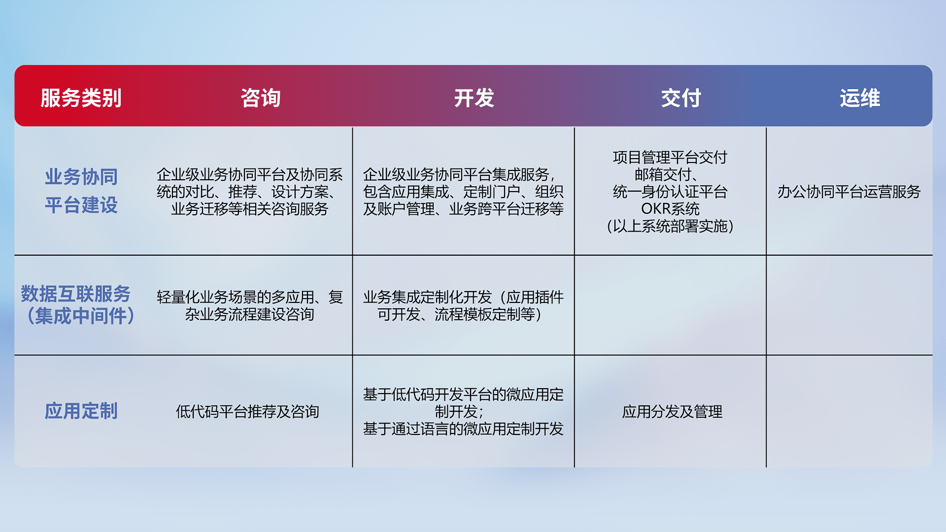 针对钉钉、、、、企微、、、、IDaas等平台级产品提供产品的规划、、、、方案、、、交付、、、、定制化开发等服务,,,实现如统一协同办公、、、智能客户服务、、混合会议管理、、智能数据查询、、、等业务场景,,实现数字化转型。。